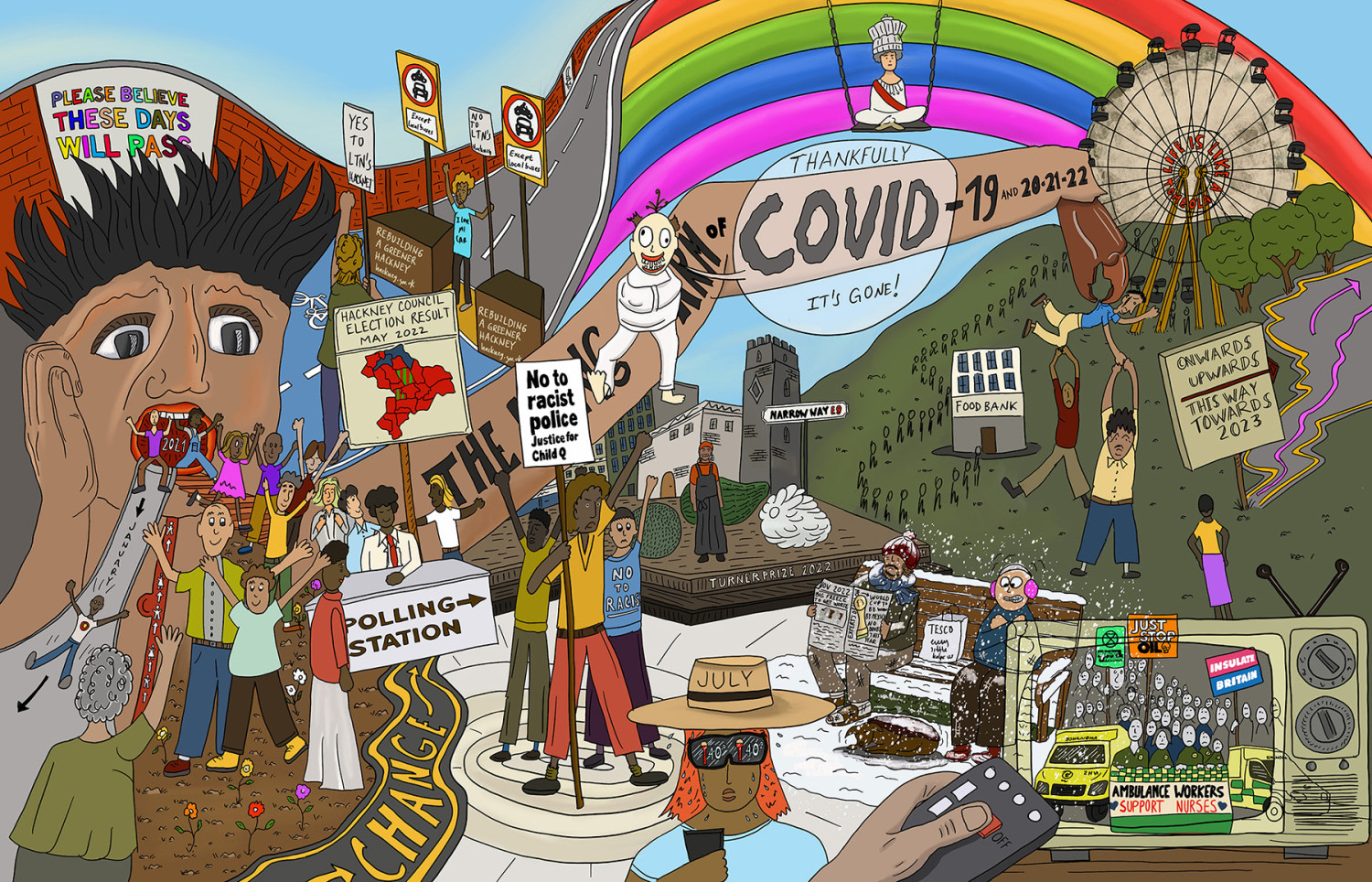 From mass protests against racism, Donald Trump’s first visit to London, and campaigns against cuts to disability services, to the unusual local debates over closing streets to car traffic, and celebrations of community landmarks such as the Curve Garden, independent bookshops, and frontline workers during the pandemic — this collaboration offered me the opportunity to see my neighborhood and community in a new, engaging, and deeply meaningful way.